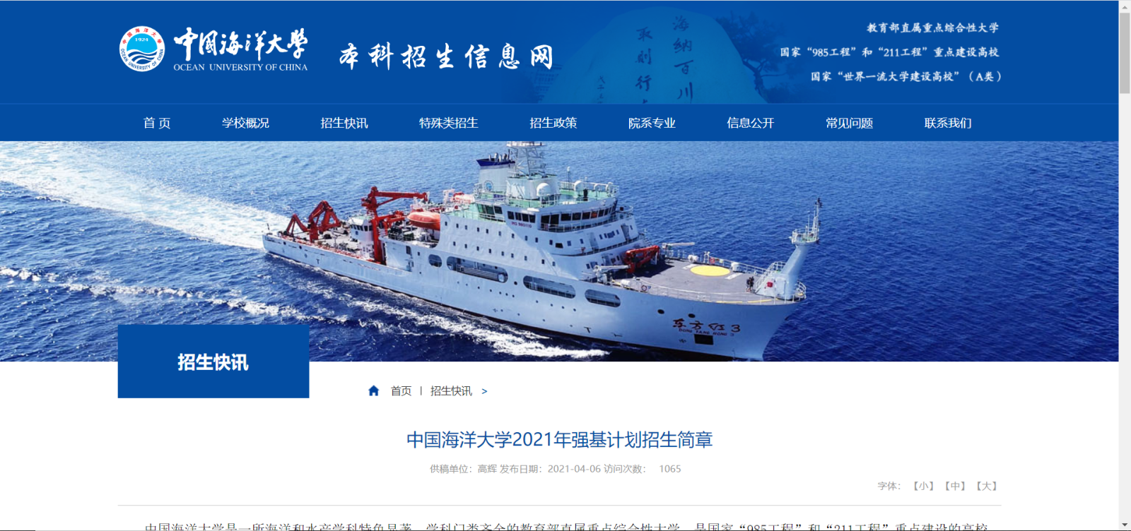强基计划 2021-04-07 10002中国海洋大学是一所海洋和水产学科特色显著、学科门类齐全的教育部直属重点综合性大学,是国家“985工程”和“211工程”重点建设的高校,入选国家“世界一流大学建设高校”(A类)。学校依山傍海,坐落在景色...
